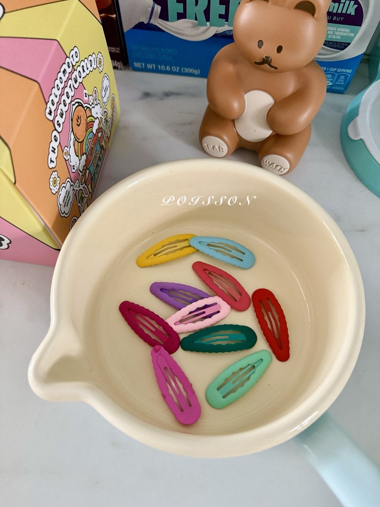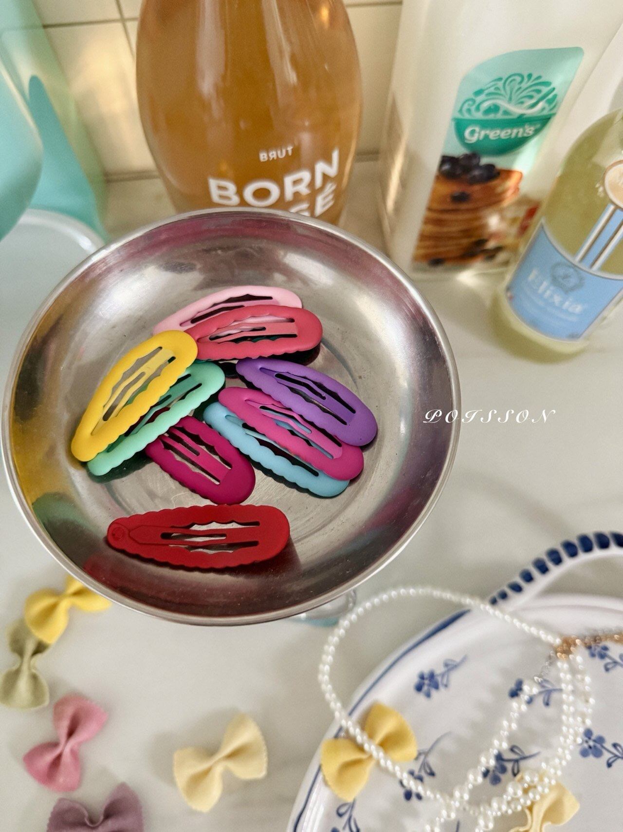ラブリーなブランドPOISSON(プアソン)の 大人気のヘアアクセサリーシリーズの ヘアピンです。 ジェリーのようなポップな感じの色味がポイントなアイテムです。 10点セットで色んなバリエーションが出来る優れたものです。 色はランダムで入ってます。 ぜひチェックしてみて下さい。