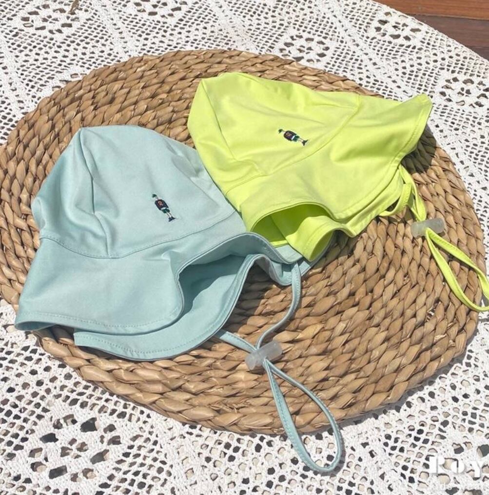 ロイの上下セット+帽子のラッシュガード水着です。帽子もセットなので、まとまり感があって可愛く着れます。(ちょっとゆったりめです) サイズ:110(S),120(M),130(L) 色はミント+茶セット、蛍光グリーン+ネイビー