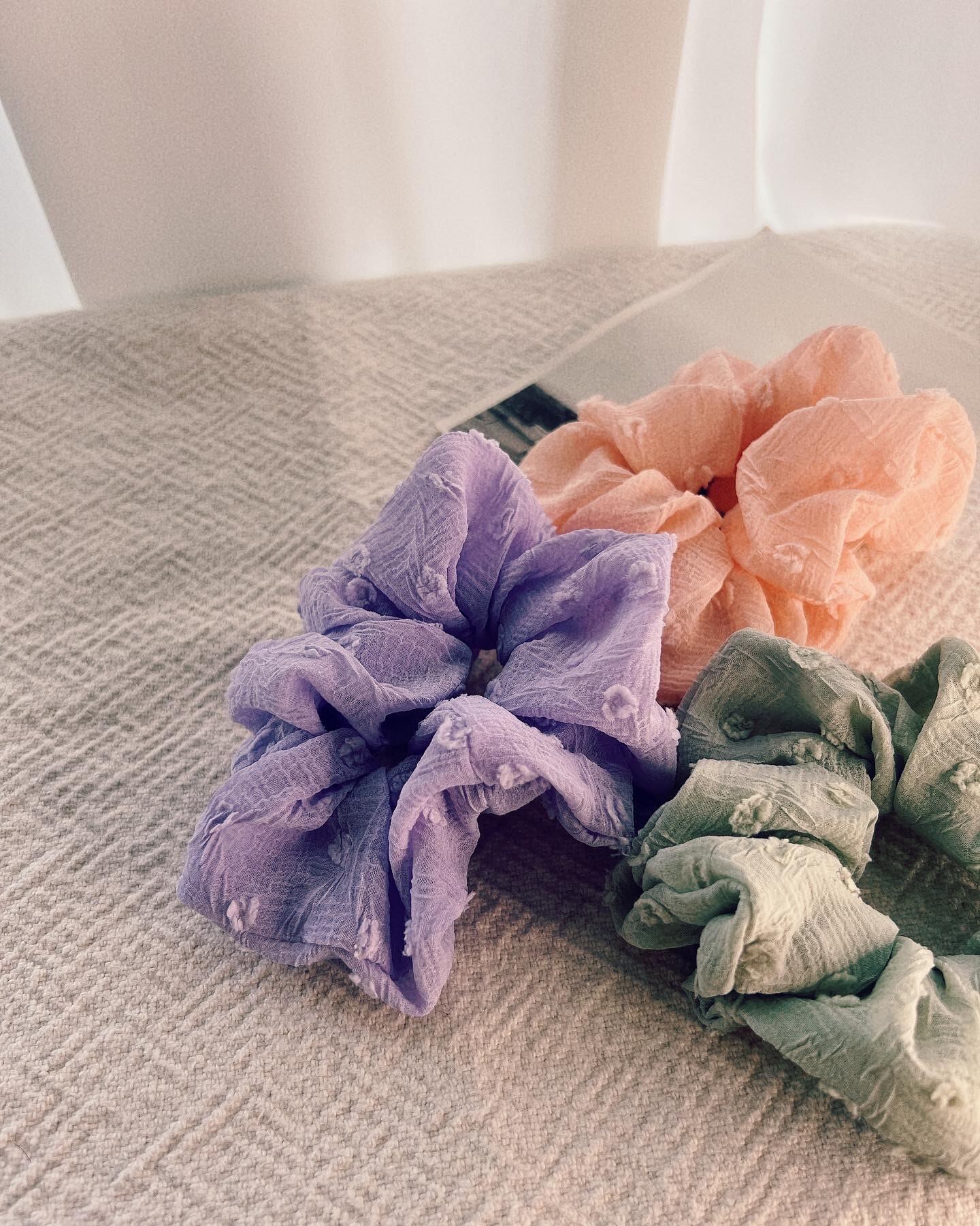 パステル色の可愛いシュシュです。 ドットのジャガードで作られて リーズナブルなアイテムです。 ぜひご覧ください☆ 色:ピーチ、パープル、ミント