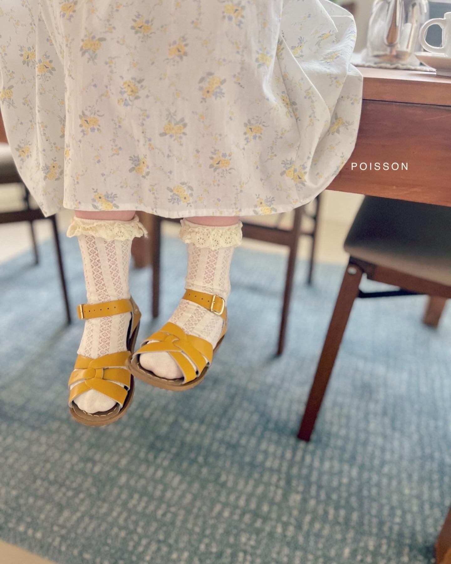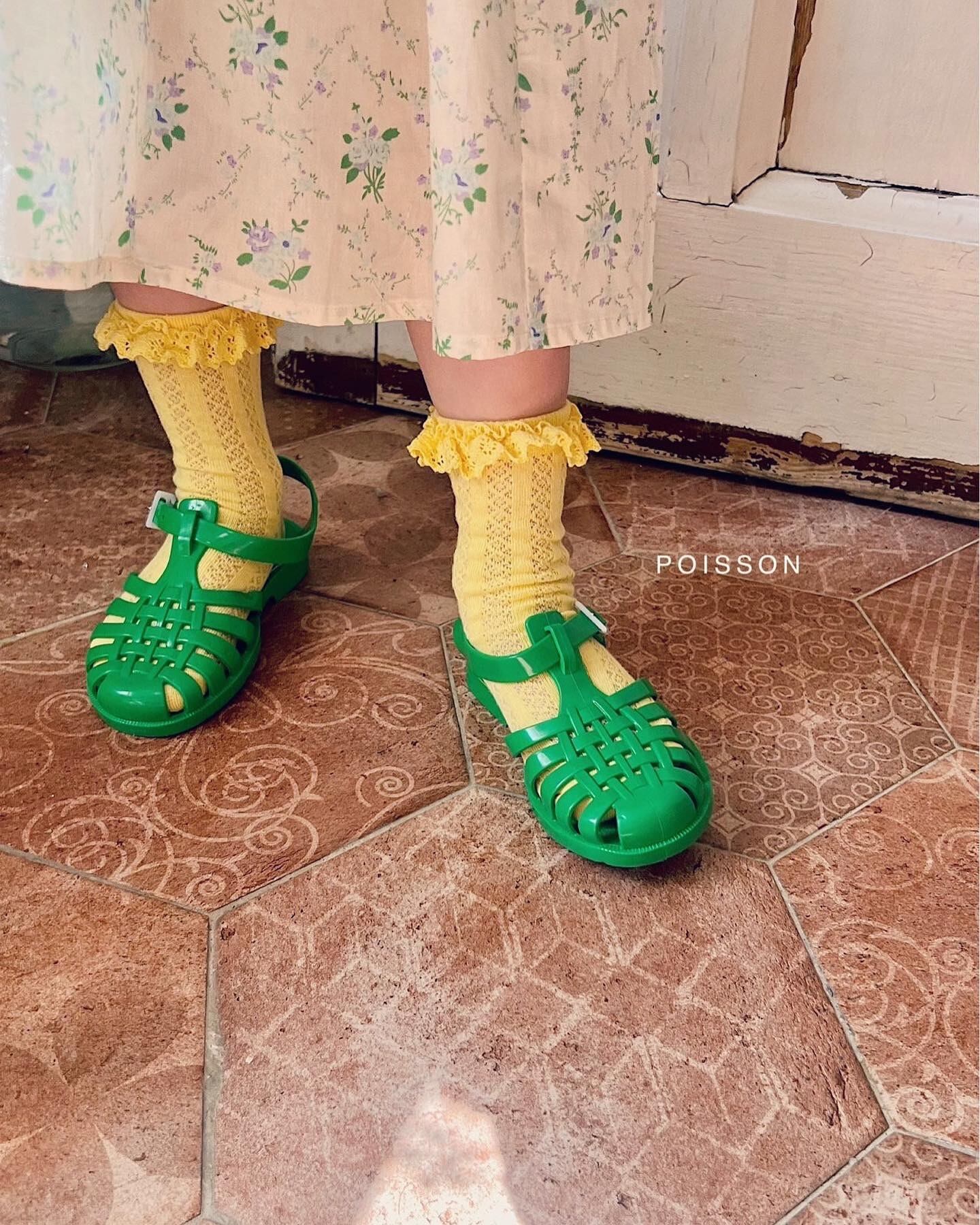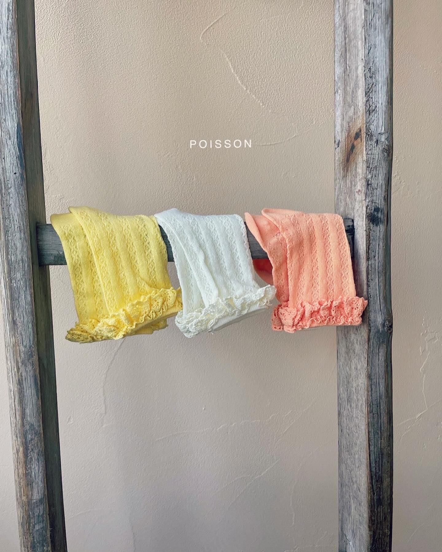ラブリーなブランドPOISSON(プアソン)の可愛いソックスです。 プアソンの独特のラブリー感を取り入れた春の3色です。 可愛いジャガードの模様が入って裾にフリルがポイントです♪ スカートやワンピース、などにコーディネートしたら、可愛いアイテムです。 ぜひチェックしてみて下さい。 サイズ:S(2-3才くらい)、M(4-5才くらい)、L(6-7才)
