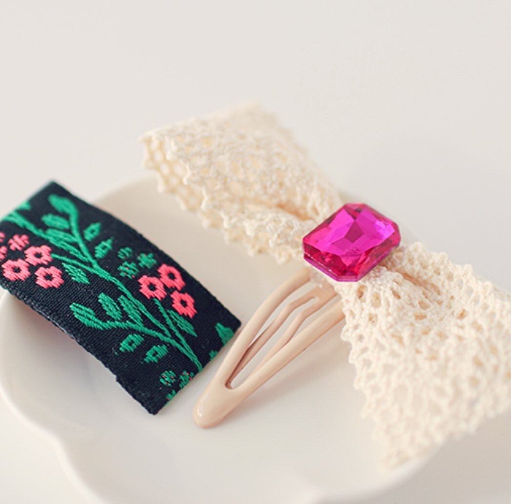 刺繍とレース+ビジューの2点セットヘアピンです。 違う雰囲気の2種類の組み合わせが とっても可愛いアイテムです。 ぜひチェックしてみて下さい。 サイズ:リボン(ヨコ9c、タテ6c) スクエア(ヨコ5c、タテ3c)