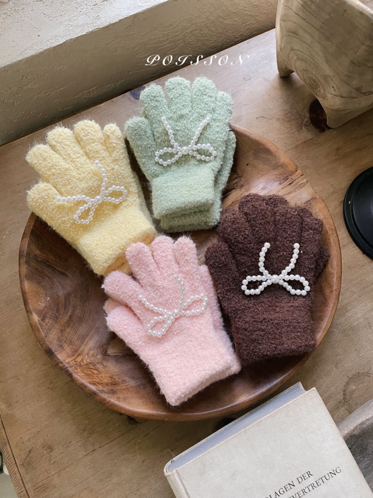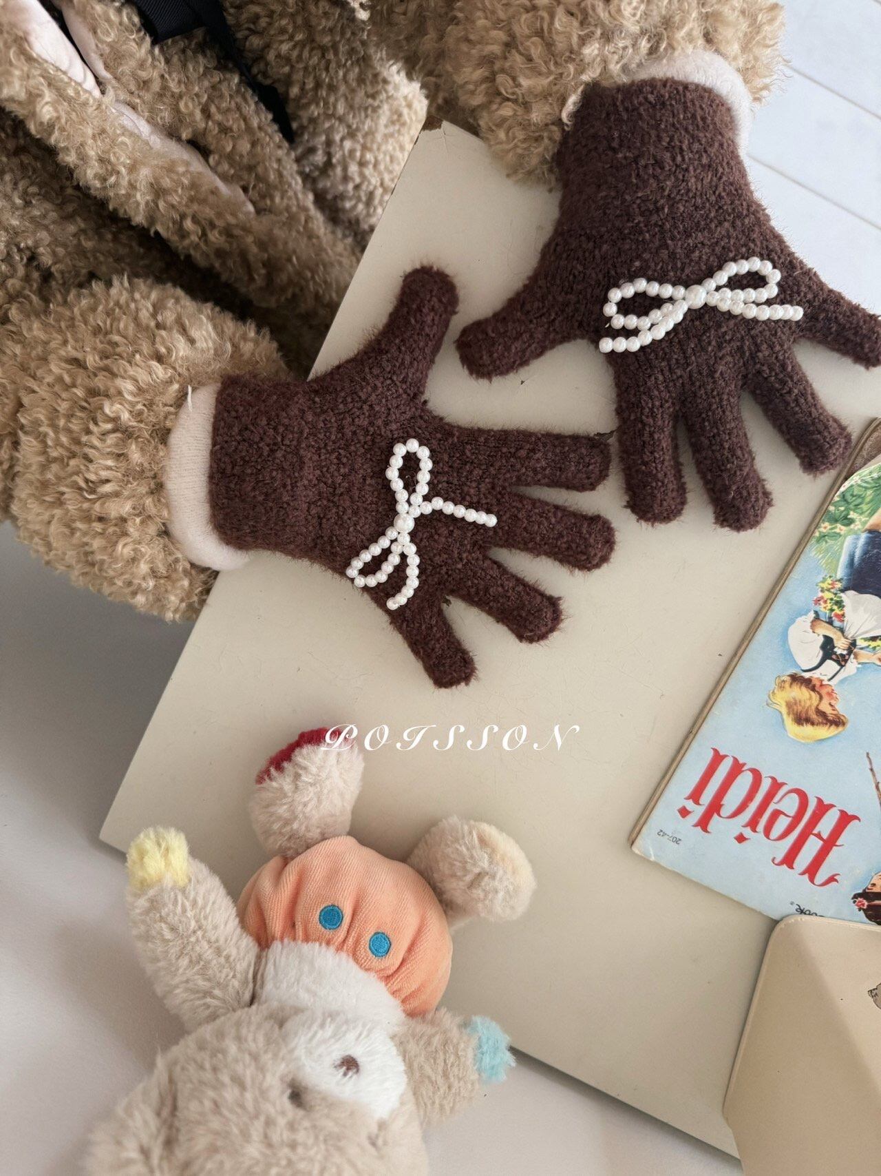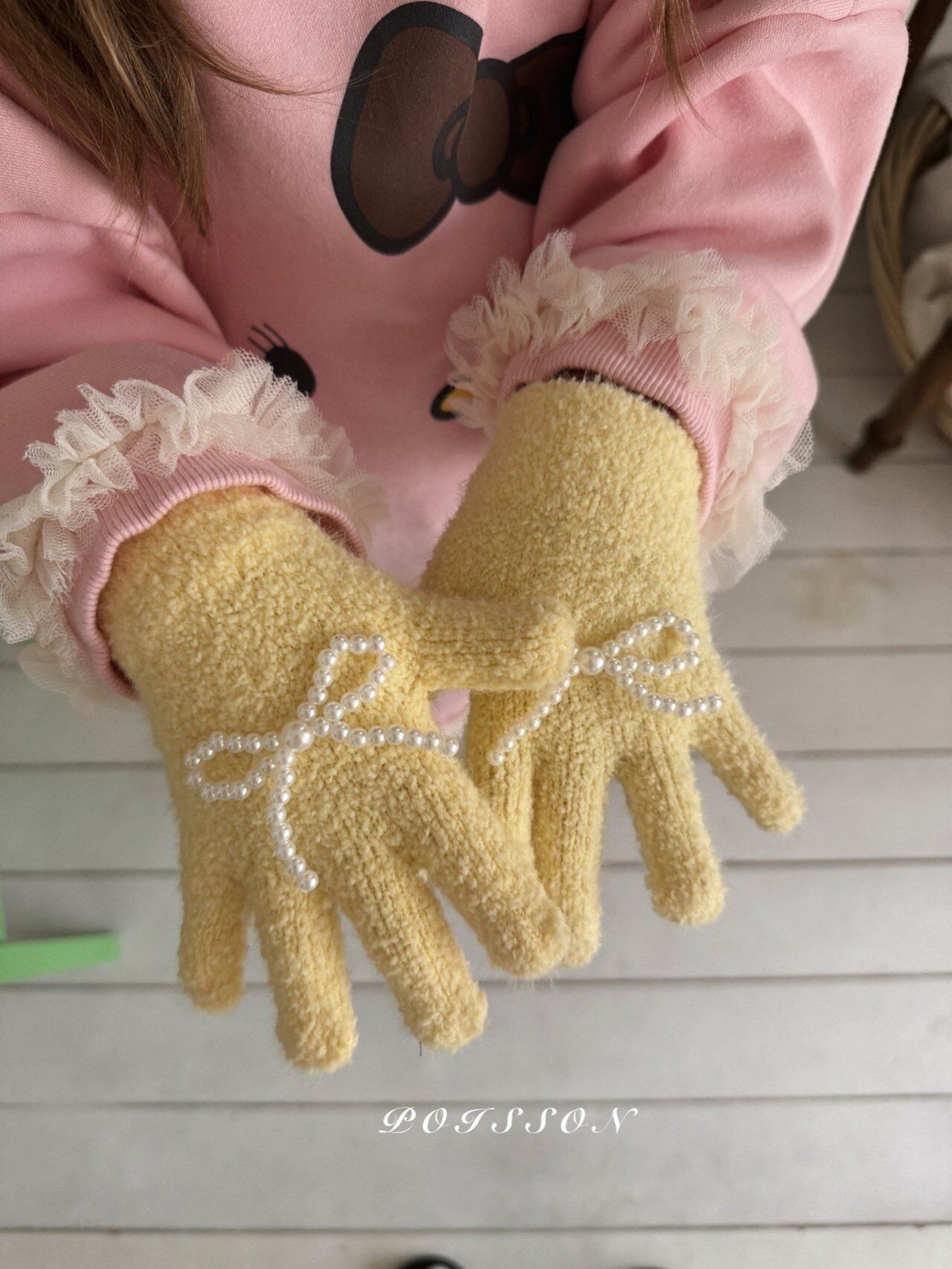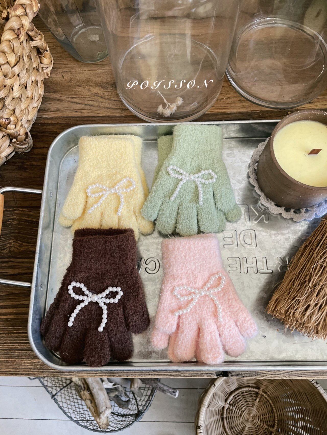 ラブリーなブランドPOISSON(プアソン)の 可愛い手袋です。 暖かいニット手袋に今年大人気のリボンがついてとっても可愛いアイテムです。 是非チェックしてみて下さい。 色:イエロー、ピンク、ミント、ブラウン